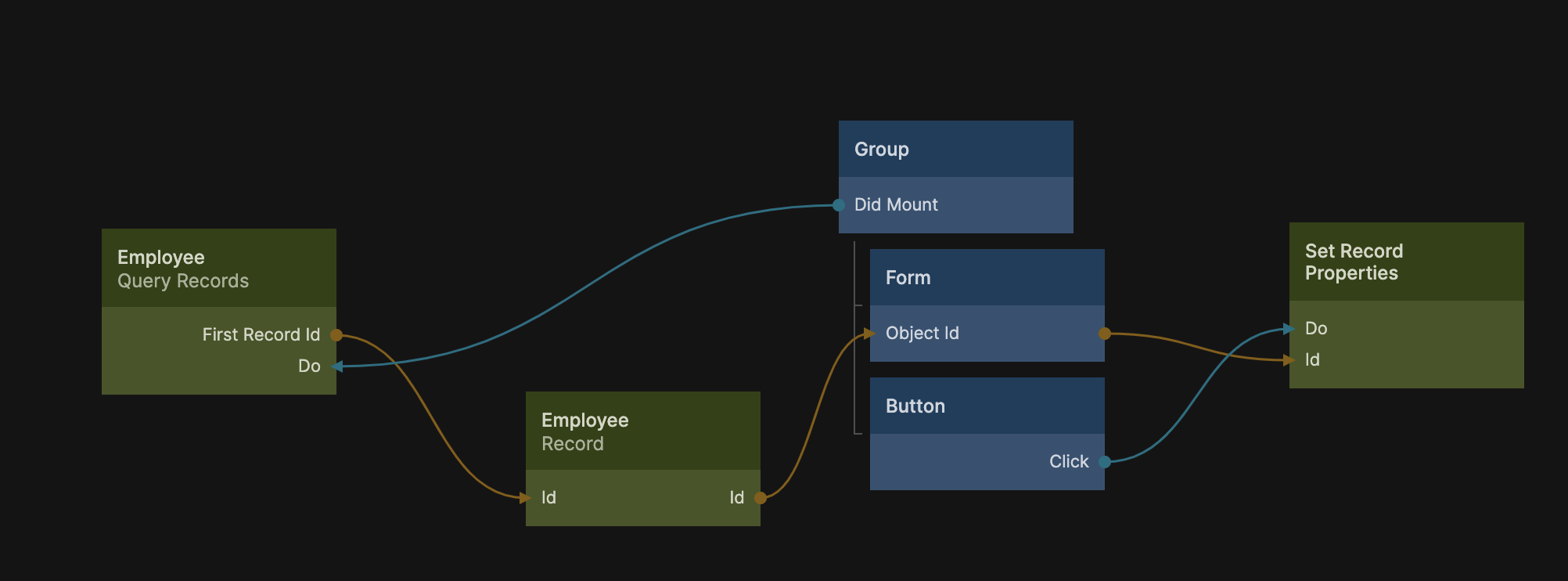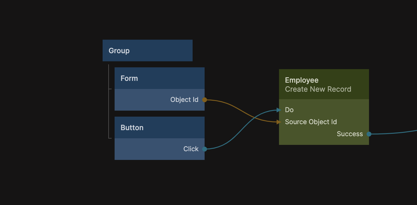 This approach is best used if you are creating a new object. You can use this together with the Source Object Id on the Create New Record node to easily create a new record from the form, e.g. when a "create" button is clicked.