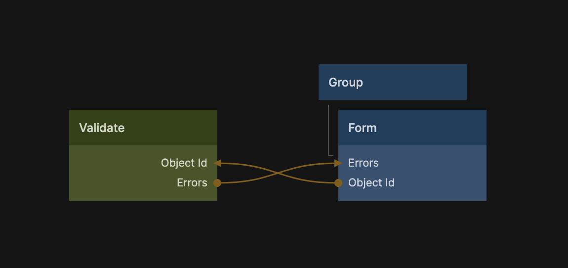 The Validate node has a very handy output called Errors that provide the errors resulting from the validation (if any) that has the correct format and can be passed directly to the Form component. You can read more about exactly how to do validation using the Validate node in the guide but in essance you provide a schema that the object must adhere to in order to be validate, and error messages if it does not pass. You can edit the schema from the properites of the Validate node, here is an example: