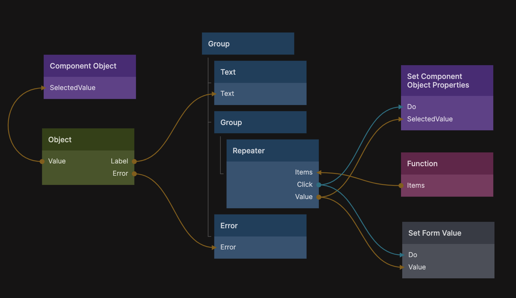 There is one important thing we left to cover. The Form component has a special action that should be used to set the value for a form control. The component is a child of the Form component and called Set Form Value. It's dragged it into the Week Day Input component and connected as follows: