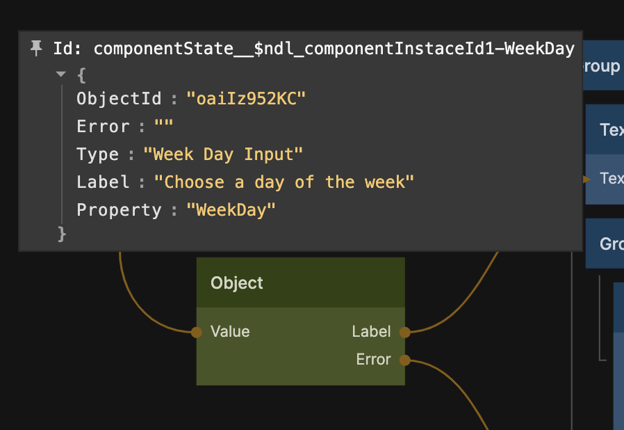 The current selected week day value is stored in the Component Object, when an item is clicked the value for that day is written to the Component Object using the Set Component Object Properties node.