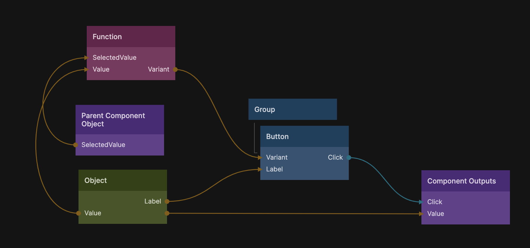 It also checks the SelectedValue of the parent component (in the function node) and supply a different variant depending on if this instance is selected or not.