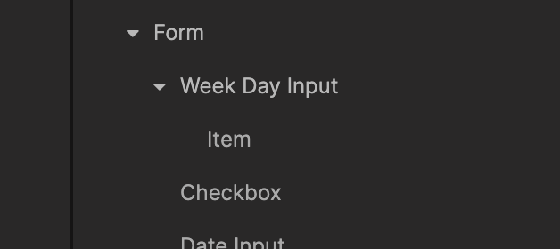You can add you own form conrols by simply adding another visual component child to the Form component, let's say we want to create a week day picker. We create a component called Week Day Input and as a child an Item component.