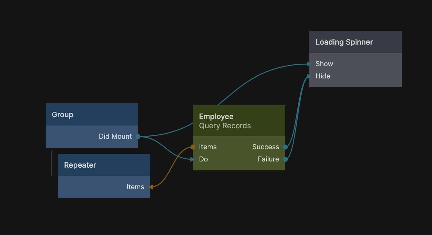 Above you can see a typical use case in combination with the Query Records node, trigger the Show signal when you start the request to the cloud services and then Hide when it finishes (remember to capture both successful and failed requests).