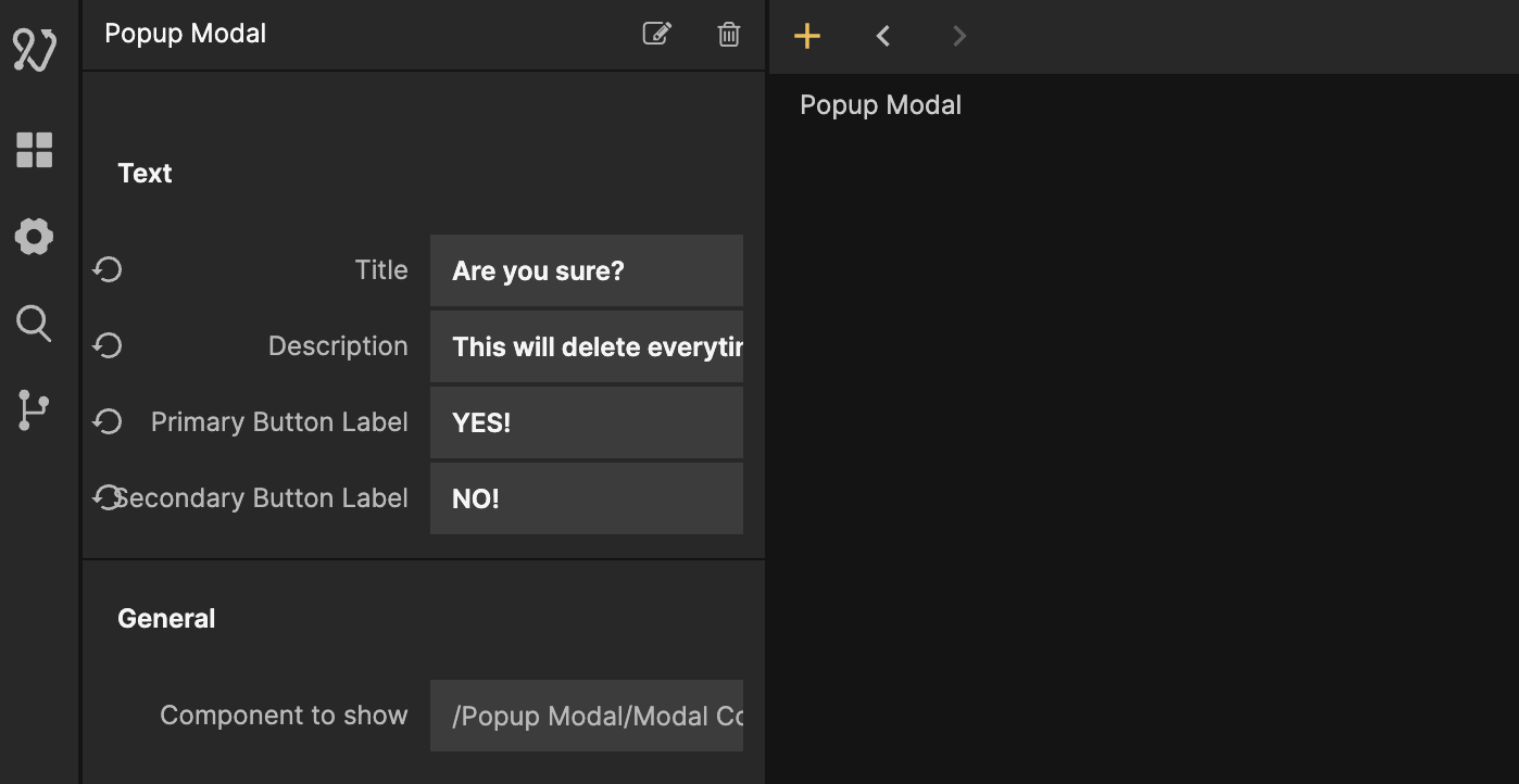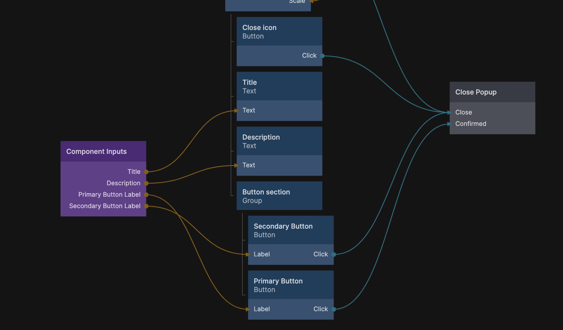 The Component Inputs is where the different labels are connected to the visual elements of the popup, and the Close Popup node contains the confirm action. You can read more about how popups work in this guide.