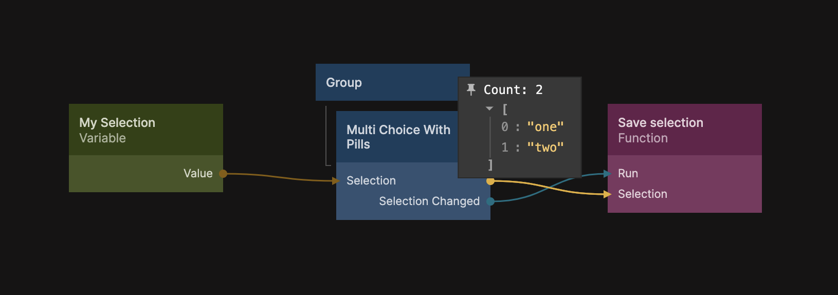 The final array is the Selection array, it contains all options that are selection. There is also an output from the component called Selection which is updated when the user interacts with the component, the Selection Changed event is triggered.