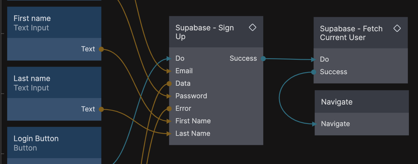 This component is used to sign up a user into Supabase. Once email address and password are set, the sign up is triggered after a signal is sent to the Do input.