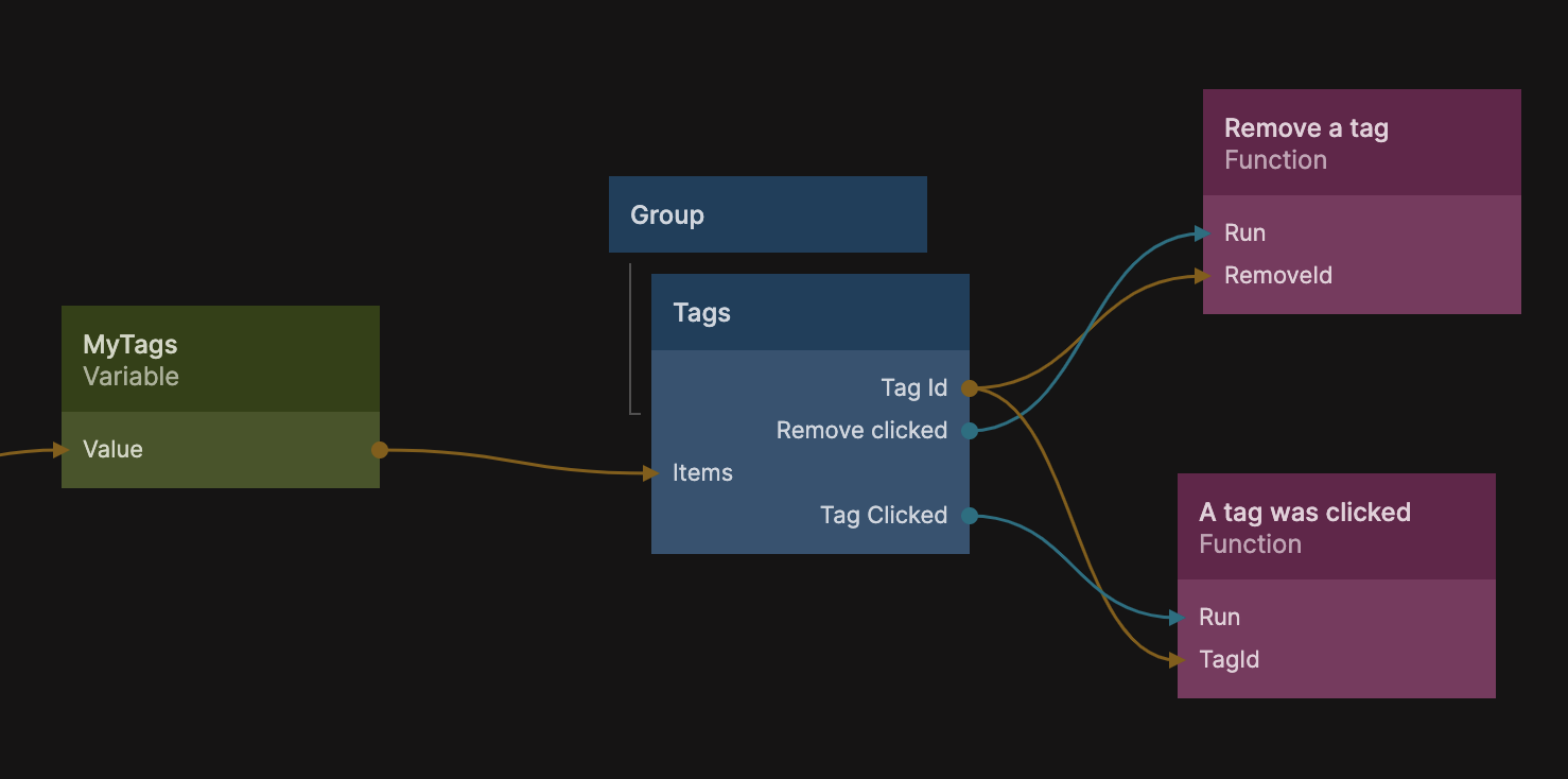 You can in the same way use the Remove Clicked signal to trigger an action when the remove cross is clicked. In the example above the MyTags variable contains an array of tags, the following Function code removes the tag.