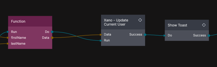 A successful update will also trigger a Xano currentUser Updated event. You can hook into to this event anywhere in your app using a Receive Event node.