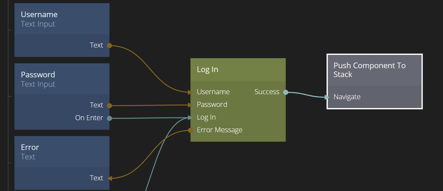 コンポーネントをスタックにプッシュノードは、コンポーネントスタックと一緒に使用して、新しいコンポーネントにナビゲートする(つまり、"スタックにプッシュする")ために使用されます。これは、アプリスタイルのナビゲーションを作成する際に典型的に使用されます。コンポーネントスタックナビゲーションの動作の詳細については、コンポーネントスタックのドキュメントを ご覧ください。