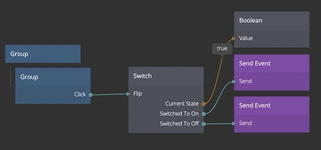 | Flip | Sending a signal to this input sets the Switch to the opposite of its current state. If it is On flip will set it to Off and vice versa. |